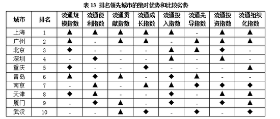 基于上述定位标准,以城市流通竞争力排名及各分项指标得分和指标排名为依据,对35个目标城市流通领域的发展情况进行全面定位。其中,绝对优势用“◆”表示,比较优势用“●”表示,绝对劣势用“■”表示,比较劣势用“▲”表示。