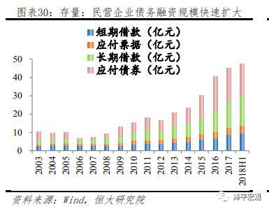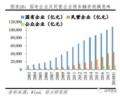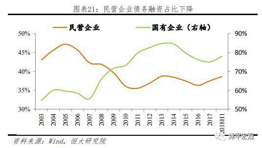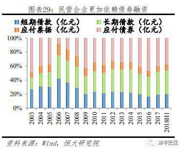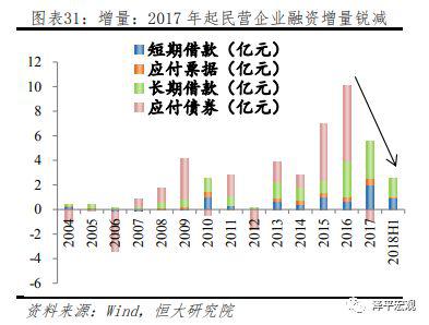 从所有制角度看,国有企业融资结构、成本及可得性显著优于民营企业。四万亿后,国有企业债务融资占比快速上升,挤出民营企业信贷资源,民营企业更多依靠留存收益及股权融资,目前国企及民营企业股权融资规模非常接近。但从债务融资角度看,国企及民企融资规模两极分化明显,国有企业借款占比长期保持稳定,且以中长期借款为主要资金来源,而民营企业中长期贷款占比较低,更加依靠短期借款、票据融资、非标融资以及债券融资。从增量上来看,上市民营企业2014年以来债券融资占比快速上升,是此轮加杠杆的主要方式,而去年以来债券融资新增量处于历史低位,叠加金融监管,非标融资收缩,民营企业融资难度自然显著加大。2017年及2018年上半年上市民营企业平均债务融资增量环比下降55%及46%,融资压力持续上升。