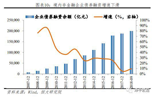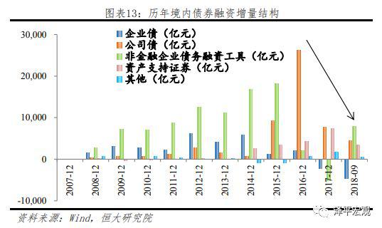 从增量来看,从稳步增加到快速缩量,债券融资增长承压。债券融资增长主要分三个阶段;(1)2016年前,非金融企业债务融资工具为企业融资的主要增量来源,其他各项规模稳步增长;(2)2016年在宽流动性环境下,公司债发行一枝独秀,占比由2015年12%提高至2018年28%,重要性显著提升;(3)2017年起,债券融资全面哑火,除公司债以及资产支持证券仍保持增长外,其他债券融资规模均显著收缩。今年前9个月债券融资有所回暖,新增非金融企业债务融资工具规模达9736亿元,已大于前两年净增量之和,而受今年信用风险频发影响,公司债发行难度加大,新增量有限,债券融资增长承压。债券融资、银行信贷及非标融资三者关键均在于到期再融资问题,“大开大合”的债券融资形势使得今年以来大量债券到期再融资受阻,信用违约事件频发,恶化企业融资环境。