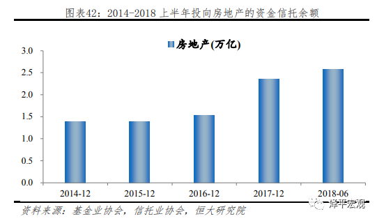 房地产行业是非标的主要投向之一。房地产行业资金需求量大,然而面临房地产调控、融资政策收紧等一系列监管约束,融资转而诉诸于非标渠道。非标的具体投向缺乏统计数据,我们通过两个方面可窥知一二。一是基金业协会和信托业协会数据显示,2017年券商资管定向通道业务投向融资类业务4.97万亿元中的9469亿、基金子公司专户3.59万亿中0.88万亿、资金信托余额(按投向)21.9万亿中2.28万亿均投向房地产,总计4.11万亿,已超当年房企债券规模的2倍。二是从资金信托总体行业投向看,投向房地产行业金额多年来仅次于金融业、租赁和商务服务业,截至2018年上半年,投向房地产业的资金信托余额为2.57万亿。