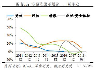 从增速来看,制造业融资结构呈现两大特点:1)银行贷款规模基本趋于稳定,2014年起制造业银行贷款增速均不超过3%,制造业融资探索多样化;2)股权融资增速较快,制造业企业经营现金流稳定、可预测等特点使其易达到上市要求,制造业股权融资占比不断提升,尤其2014年IPO加速以来,股权融资增速一度达到25%以上,但2017年以来增速持续下滑。