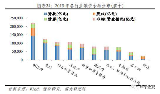 从行业角度看,按照融资特点可将行业分为:1)制造业与重工业:融资总量大,对于银行贷款依赖度相对较低,占比约为60%,前者更加依赖股权融资,后者多为国有企业,具有政府隐性担保,债券融资比例更高;2)基建和房地产相关产业:主要包括交运、建筑、水利、租赁及商务服务业和房地产行业,对银行贷款依赖度处于中等水平,平均占比70%,同时是非标融资占比最高、总量最大的行业;3)服务于工业企业流通环节的批发与零售业:融资高度依赖银行贷款,占比达80%以上;4)新兴行业:信息传输、计算机服务和软件业,主要依赖股权融资,占比超过60%,其中私募股权占比超90%。