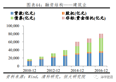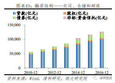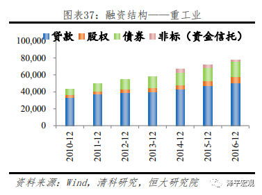 重工业行业主要包括采矿、电力、燃气及水的生产和供应业等行业,融资需求量大。重工业及制造业融资结构较为相似,在融资来源中,银行贷款占比均为60%上下,且由于表内贷款对于过剩产能行业的监管较严,增速较慢。然而和制造业更加依赖股权融资不同(占比约21%),重工业企业多为国有企业,具有政府隐性担保,更易实现债券市场融资(占比约26%),除此之外,2016年末重工业股权融资占比约11%,非标融资占比有限,仅3.4%。