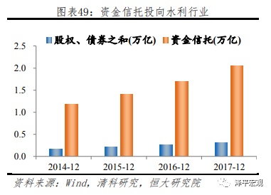非标融资是基建领域重要资金来源之一。从资金信托按投向数据来看,与基建紧密相关的建筑、租赁商服、水利三大行业均为资金信托前5大投资领域,2018年6月底规模达5.89万亿,占当年资金信托总余额的31%。其中租赁服务和水利行业,资金信托余额远超其债券、股权融资之和,是债务融资重要方式。