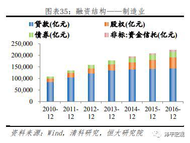 制造业涵盖范围广阔,融资总量明显高于其他所有行业,贷款、股权融资总量均是所有行业中的第一位,2016年末融资余额分别为14.4万亿、4.7万亿,占社会总贷款余额、总股权融资余额的20.0%、36.0%。从行业本身融资结构来看,虽然近年来贷款占比逐步减小,但仍在65%以上。截至2016年,制造业贷款占比65.0%,债券占比11.3%,股权融资占比21.4%,非标仅有2.3%。