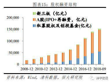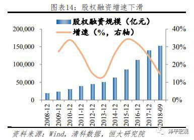 截止2018年9月,我国股权融资规模总额约为15万亿,为企业融资来源第四位。股权融资增速波动明显,近三年来增速持续下降。我国股权融资主要包括股票融资、私募股权融资以及新三板融资。从结构来看,截止9月末,A股IPO及再融资总规模约为9万亿,私募股权及创投基金投资未上市企业规模约5.5万亿。2009年至今,股权融资发展较快,增速长期高于股票融资。今年以来,随着市场行情走弱,股票融资规模增速迅速下滑,股权融资受金融严监管影响,资金来源受限,同样面临显著的增速下滑。