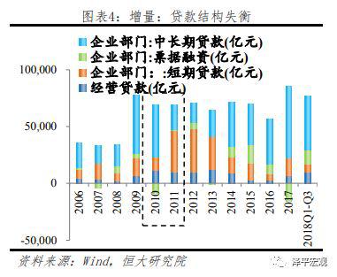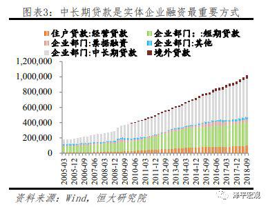 贷款是我国实体企业长期以来最主要的融资渠道。截至2018年三季末,央行公布的企业部门贷款余额达88万亿元,考虑住户部门贷款包含个体工商户以及企业主以个人名义举借的经营性贷款,加回该部分,得到截至2018年三季末,对实体企业贷款余额约98万亿,增速达10.2%,占实体企业总融资规模60.2%。从结构上来看,自2009年起,中长期贷款为银行信贷投放的最主要方式,占比约为40-50%。