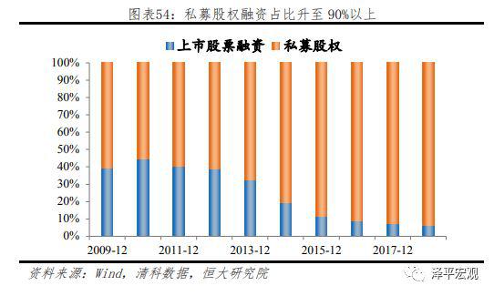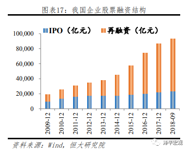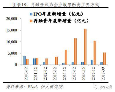 具体在股票融资领域,IPO融资量在近10年基本保持平稳,占融资存量比例不断下降,而再融资规模自2014年以来快速上升,显著超越IPO融资规模,逐渐占据A股企业股票融资主导地位。截止2018年9月末,IPO及再融资规模比例约为1:4。