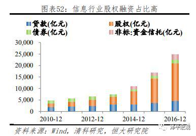 信息行业股权融资占比高。信息传输、计算机服务和软件业作为新兴产业的代表,属于轻资产行业,人力资本和知识产权都很难抵押来进行债务融资,而股权融资可以分担风险、鼓励创新,因此其股权占比高,且多年来不断提升,2014年-2016年股权融资占比由53.1%跃至65.8%,其中私募股权占比由80.6%上升至91.1%。