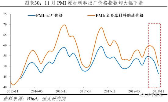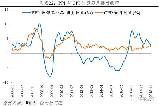 七、CPI回落,PPI大跌,今年滞涨明年通缩,企业利润下降,实际利率水平上升。11月CPI、PPI同比2.2%、2.7%,比上月下降0.3、0.6个百分点。从库存周期的角度,2016-2017Q2复苏,2017Q3-2018Q3滞涨,随着内外需收缩,库存周期正步入通缩,经济和物价双降的衰退期。近期CPI、PPI双降,PPI加快下跌,企业利润将下行。PPI下降,意味着企业的实际利率水平上升,因此,必须加快降息对冲。