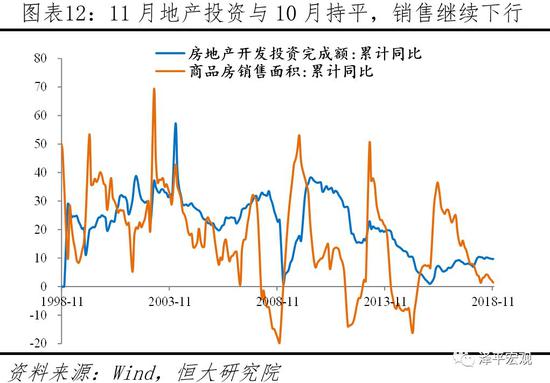 今年以来受“举债终身追责”和防范化解债务风险影响,地方政府缺乏投资意愿与资金来源。随着1213政治局会议提出“稳投资”、“激励干部担当作为”,国办明确补短板方向,要求保障在建项目不得盲目抽贷,发改委提出鼓励优质企业融资补短板,货币金融监管未来边际放松,基建在明年将反弹但幅度有限。今年以来,增值税、关税、个税改革等减税降费措施取得效果,国家税务总局通知四季度税收延缓入库,四季度的财政税收增速下滑,制约支出。11月财政收支增速同时再度下降,其中11月份当月财政、税收收入增速为负,分别为-5.4%和-8.3%。9月、10月财政支出增速为11.7%和8.2%,但11月下滑至-0.8%。1-11月支出累计同比为6.8%,低于去年同期的7.8%。