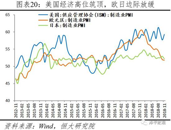 二、受美欧经济放缓和贸易摩擦影响,新出口订单持续回落,抢出口效应退却,出口大降。1)11月中国出口集装箱发往美东、美西的运价指数大幅回落,抢出口现象基本退却。2)新出口订单连续6个月在荣枯线以下,处于近三年低点。3)全球经济放缓,全球制造业PMI为52%,连续7个月下滑,处于2016年10月以来的低点。4)G20虽暂时达成不加征额外关税的共识,但90天谈判结果前途未卜。
