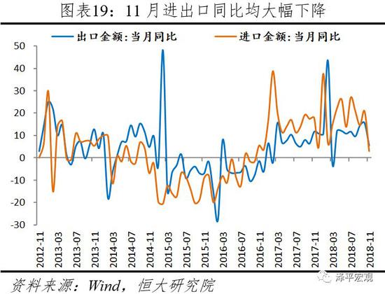 11月进出口同比均大幅下降,出口大幅回落,主要受全球经济放缓、贸易摩擦及高基数效应影响。11月出口同比5.4%,较上月大幅下降10.1个百分点。分国别和地区看,对美、欧、日发达经济体出口同比均大幅下降,分别较上月下降3.4、8.6和3.1个百分点,其中对美出口增速为6%。对中国香港、中国台湾、韩国和新兴经济体如印度、巴西、俄罗斯等出口均大幅下降,其中,对东盟出口已连续三个月同比下滑。11月进口同比3%,较上月下降17.8个百分点,源于内需下行、大宗商品价格下降以及去年高基数。分进口产品看,农产品、大宗商品、机电产品和高新技术产品均大幅下降,其中,大豆进口数量同比下降56个百分点,进口金额同比下降60个百分点。
