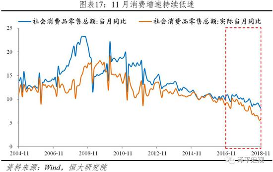 消费增速处于2003年以来的低点,受收入下行和负债挤压的影响。11月社会消费品零售总额同比名义增长8.1%,较上月回落0.5个百分点,实际增速5.8%,较上月回升0.2个百分点。1-11月累计增速9.1%,较上月下滑0.1个百分点,“双十一”提振效果有限。前三季度居民人均可支配收入名义增速7.9%,与去年同期相比回落0.4个百分点;我国家庭债务/GDP达到48%,挤压消费;今年以来汽车拖累消费明显,11月当月销售额同比-10%,1-11月累计销售额增速-1.6%,今年车辆购置税恢复按10%的税率征收。