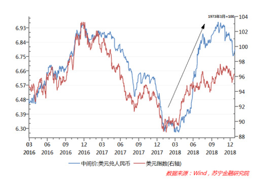 由于2018年美元指数的低点正好出现在春节前后(2018年2月14日89.02),因此下文讨论的美元升值周期,以该时间为起点截止到2019年1月24日。整体来看,在此期间,美元指数从89.02上升到96.32,升值幅度达8.2%,同期人民币对美元中间价汇率也从6.34贬值到6.78,贬值幅度接近7%(参见下图)。可见,过去一年内,美元升值幅度与人民币对美元贬值幅度相差不大。