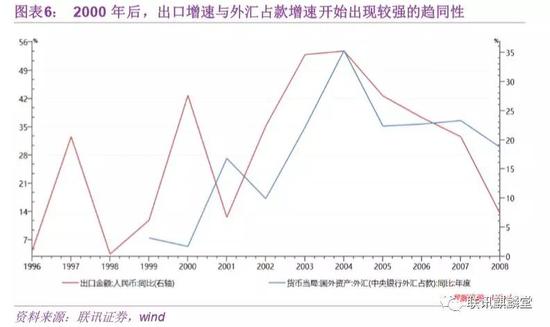 但在2001年中国加入世贸组织,外需潜力被释放后,大量出口形成的外汇被央行不断买入,使央行资产端积累了大量的国外资产(即外汇占款),负债端被动增加了大量的储备货币,商业银行信用派生有了充足的子弹。