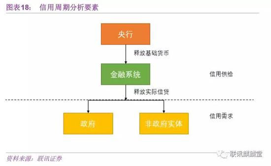 央行控制流动性,将高能货币发放给金融机构;金融机构获得基础货币后,在存款准备金制度下,通过信用派生机制影响实际的货币总量,为实体经济提供信用供给;而信用需求端包含政府和非政府实体两个部分,在非政府实体需求不旺盛的时候,政府往往会扩大需求来托底。