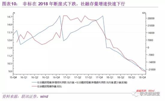 从社融口径看,非标项中最为重要的委托贷款和信托贷款在2018年出现了断崖式的下滑,两者新增规模合计较2017年减少了5万亿,拖累社融存量增速(新口径)下滑3.6个百分点。