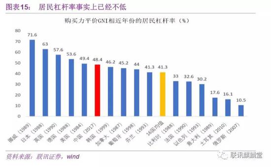 作为核心驱动力的居民部门,虽然在2016-2018年面对着持续趋严的地产调控仍然保有较强的加杠杆动力,但如今居民部门的债务/可支配收入已经超过美国,相似水平的GNI背景下,居民杠杆率(48.4%)已经高于16个具有典型代表的发达国家平均水平(41%)。