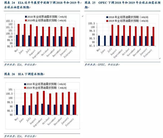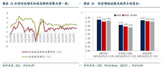 全球经济增长和燃料消费的走势较为一致(如下图),预计2019年主要石油需求国经济增速将有所放缓,上半年主要是中国需求的放缓为主导下半年是美国需求放缓主导(在上半年经济美平我差,下半年美拐我稳,详细观点请见【华创宏观】紧握黄昏中的手表-海外年报&请回答2019系列三。IMF、Word Bank和OECD纷纷下调了2018及2019年全球经济增长的预测,意味经济走弱将拖累全球石油需求。同时EIA、OPEC和IEA纷纷调降了对2019年石油供给的预期。