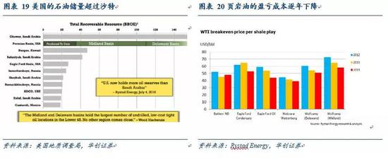 长期来看,页岩油储量较高、开采成本逐年下降:根据Rystad Energy的报告,美国石油可采储量合计为2640亿桶,超过了沙特的2120亿桶和俄罗斯的2560亿桶,其中超过半数是非传统页岩油。根据美国地质调查局16 年发布报告显示,美国Permian 盆地的Wolfcamp 页岩层的技术可采储量上升至200 亿桶石油,16 万亿立方英尺天然气,16 亿桶天然气凝析液,仅次于沙特加瓦尔油田。美国部分地区如二叠纪米德兰盆地页岩油的出井成本已经下降至36美元/桶。