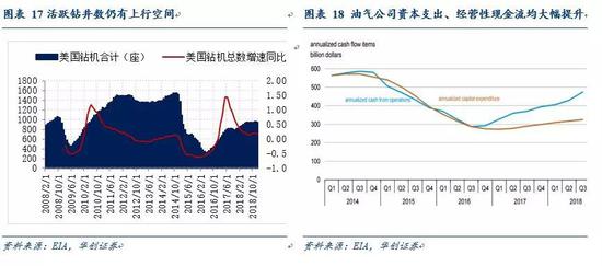中期来看,页岩油公司的资本开支上升 管道运输能力2019年将得到改善:一方面,油气公司财务状况持续改善将支撑中期石油产量:活跃钻机数量(Active Rig count)反应3-6个月后的增产能力,如果活跃钻头数量多那么意味着近期打井数量多,意味着未来产量高。而美国页岩油增量钻机数的变动与资本支出呈现较好的同向性,资本支出又是油价的滞后指标。目前主要页岩油公司财务状况有所改善,将支持页岩油的未来开采。CAPEX与油价正相关,滞后油价1-2季度左右。2018年第三季度,布伦特石油价格较2017年第三季度上涨45%,平均每桶76美元,为2014年第四季度以来的最高水平,高油价为石油生产企业带来更高的现金流。全球油气行业2018年前三个季度的财务状况有明显的改善,据EIA的统计 2018年第三季度全球能源公司的现金流同比增长45%,资本支出同比增长11%。2018年四季度虽然油价大幅下滑,但考虑到油价回调后仍处于近年的相对高位,资本开支仍会保持相对增长。另一方面,充裕的现金流和高油价也使得今年以来美国生产商开始投资扩张管道运输能力(管道运输能力一直是限制美国石油供给的瓶颈)。年初天然气和石油管道公司完成了一段从米德兰到德州海岸的管道,运力为57.53万桶。据统计,到2019年末,二叠纪地区的管道运力将新增245万桶/日。