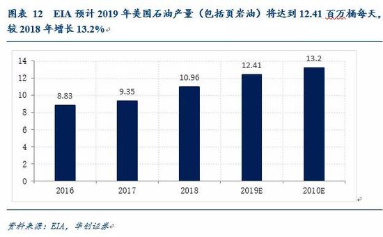 从短期(2018年末美国已钻未完井仍在高位)、中期(页岩油公司的资本开支持续上升+管道运输能力2019年将得到改善)和长期维度(页岩油储量较高、开采成本逐年下降)来看,2019年美国页岩油产量上升动能仍强。根据EIA预测,2019年3月份美国7个关键的页岩油生产区日产量将增加8.4万桶/日,达到839.8万桶的历史新高,预计2019年美国石油产量将较2018年增长13.2%。