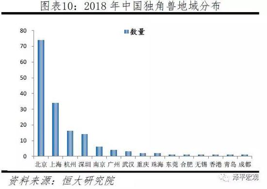 北京吸纳和催生独角兽74家全国第一。从地域分布来看,独角兽集中“北、上、杭、深”的特征维持不变,四城无论是在经济发达度、制造业成熟度、人才质量、政策优惠度和基础设施完善度都处全国前列,2018年四城数量占比达85.7%、估值占比达94.5%。其中,北京独角兽共74家、较上期增加16家、总估值2979.4亿美元荣登第一,数量占比46%,较上期增长1个百分点,比重持续增加;上海共34家、较上期增加6家、总估值1325.1亿美元;杭州共16家、较上期增加2家、总估值1946.5亿美元;深圳共14家、较上期增加4家、总估值490亿美元。此外,北京继续引领高估值独角兽,估值前十企业北京占一半。