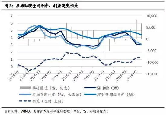 而如果货币市场利率显著低于结构性存款(早期为保本理财)利率,则居民可以通过票据套利,以存入结构性存款为保证开出银行承兑汇票,然后贴现(票据贴现利率与货币市场利率关联性较强),赚取利差。于是,每当票据贴现利率较低,而结构性存款利率相对较高的时候,两者利差扩大,票据贴现量便会放大,里面有不少套利者。