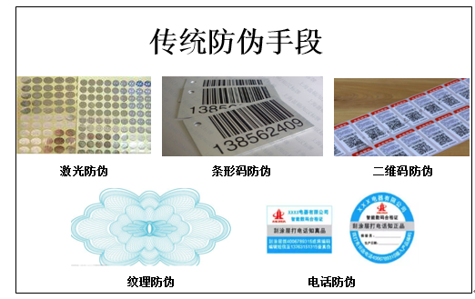 为了和伪劣商品区分开来,传统的防伪手段主要有激光防伪、条形码防伪、纹理防伪、电话防伪、和二维码防伪。伪劣产品之所以盛行,除了销售价格和低廉的“犯罪”代价原因外,制假成本低、防伪技术易破解、里应外合串通一气也是重要的原因。激光防伪和纹理防伪除了极易被印刷模仿外,消费者肉眼也很难辨别出真伪,在鉴别百元人民币时,有多少人会在收款时非常细致的查看一条条纹理细节?条形码防伪也并不是一种防伪手段,它实际上仅仅是携带商品信息的一种“身份证”,同时也非常容易被转让和复制。防伪标签是我们经常在商品包装上看到的一种防伪手段,但是喷涂虚假电话号码和创建虚假验证数据库也经常会让这种防伪手段形同虚设。