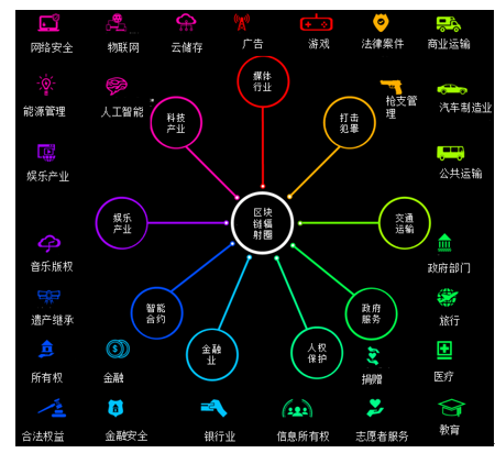 当然了,食品溯源只是区块链中非常小的一个分支,它还可以用作奢侈品鉴定、疫苗溯源、投票溯源、洗黑钱溯源等等。区块链的未来潜力非常大,其辐射圈几乎能涵括所有产业(如下图)