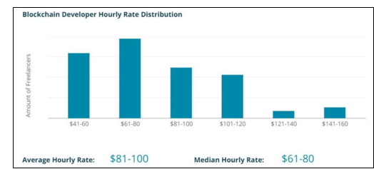 但是区块链也并不无缺点,造价贵、传输延迟、能源消耗量大、51%攻击都是它潜在的缺陷。费用上,一个合格的区块链人才的平均小时工资在81-100美元左右(下图),IBM提供的成熟区块链基础价格起步线是122万,在德勤发布的《区块链主要挑战》一文中指出比特币网络每年的运行成本高达600万美元。有数字经济学家估计,整个比特币网络将在2018年使用42TWh的电力,领先于新西兰和匈牙利,由此产生的CO2排放量将相当于100万次跨大西洋航班。