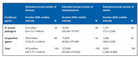 美国疾病控制和预防中心(CDC)统计,每年美国预计有2870万-7110万人因为食品病毒而得病,将近13万人需要住院治疗,3037人因此丧命(下图)。在全球范围内,世界卫生组织(WHO)统计称每年有6亿人因食品病毒而得病,42万人丧生。