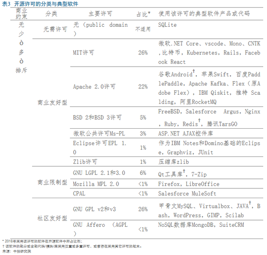 传统的专利许可(proprietary license)主要是维护商业机构利益,开源软件许可则更多从维护社区和公众自由权益着眼,此外也有开源软件甚至无需许可。按对商业授权的容忍程度从低到高,开源软件许可分为社区友好型、商业限制型、商业友好型三类(见表3):