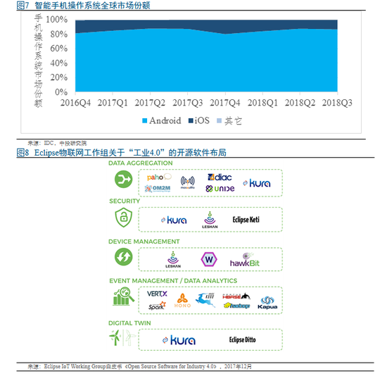 新兴技术领域和生态培育是开源软件创投的焦点。开源软件在区块链[7]、深度学习、无人机、自动驾驶等新兴技术领域起创新引领作用,这些新兴领域的技术标准和行业规范仍在不断更新演化中,而开源社区的多元性和开放性已经被证明有助于孕育创新,这种自组织形态带来的分布式协作创新机制正是商业组织不擅长的。公司通过主动发起或积极参与相关开源软件项目,不但可以吸引外部开发者群策群力,在一定程度上减少研发成本,更可以围绕自身战略和特长培育生态系统,从而获取话语权乃至确立行业领先地位。这方面有很多例子,如谷歌发起的Android开源项目成为比苹果iOS使用更广泛的智能手机操作系统(见图7),谷歌借此建立起相应的商业生态系统,吸引了苹果公司以外的几乎所有手机公司参与,进而在不同程度上受制于谷歌或者说形成合作。此外,以RISC-V开源芯片架构、“工业4.0”(见图8)等为代表,开源软件的商业化进一步渗透与硬件高度耦合的领域[8]。