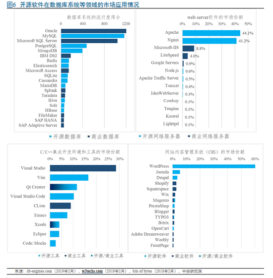 开源软件的主要投资机会来自企业客户领域(2B端)。开源软件在服务器、操作系统、数据库、计算机语言、开发工具、互联网等若干软件基础设施领域必不可少甚至占据主导地位(见图6),微软、IBM、Oracle、Salesforce等行业巨头不断加码投资收购开源软件资产,以巩固主业或抢占先机,这种策略的好处至少有几点:一是直接获得相对成熟的技术和产品,稀释了研发风险;二是可以争取到相应的开源社区支持或者绑定社区开发者,事实上包括谷歌在内的很多大公司都有不少员工全职从事开源软件的开发维护,与开源社区形成了良好的互动,公司可以在保持开源版的同时提供商业版,通过差异化服务寻找盈利点;三是基于社区共识的开源软件更容易帮助商业公司建立和维持行业标准,进而达成领先地位。另一方面,在消费者市场(2C端),以及与特定行业知识深度绑定的部分2B市场仍以商业产品为主流,开源软件在这些领域中仅作为基础设施和工具而不是最终产品服务存在,例如机械和建筑设计、电子与半导体设计、工业仿真与建模等。应当指出,这种现象并非受限于开源软件业者的开发能力——即便复杂如操作系统、数据库这样的大型软件系统都已经被开源软件占据了大半江山,本质原因在于,相对松散的开源社区和兴趣驱动的自由开发者往往缺乏充足的资金和持续的时间投入,也无法得到跨行业的企业资源和专家支持,难以实现有效的需求交互和售后服务。粗略看,除非有政府或者行业巨头的大力扶持,即便是激进的投资者对于这些细分领域的开源软件创投也应保持额外的谨慎。
