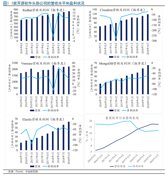 以开源软件公司为例,除了Redhat、Vmware等少数公司实现了可持续的盈利,大部分开源软件公司仍处于“烧钱”阶段,若以同期美国套装软件(packaged software)行业整体盈利水平为参照(见图5),这种反差更为明显。值得注意的是,近年来Cloudera、MongoDB等头部开源公司营收增长的同时利润缺口不断收窄,股价的上升也反映出投资者对成长性的正面预期。