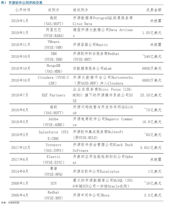 此前,微软、Salesforce、EQT Partners私募基金等分别发起了对开源软件公司的大型收购(见表1),而且开源软件公司的投融资活动趋于活跃(表2)。我们认为,这些迹象表明,自从云计算时代为软件行业带来新的服务付费模式后,长期以来受困于商业模式的开源软件行业可能迎来了转折点。