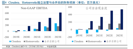 控制研发和测试等成本。对于创业公司,开源软件提供了快速切入的机会,减少了购买商业授权许可所需的前期投入;对于成熟公司,将部分研发任务“外包”给开源社区,可以在一定程度上减少研发成本。另一方面,基于相同开源代码开发产品的软件公司可以通过并购优化成本结构,例如Cloudera在合并报表中指出其与Hortonworks合并将形成协同效应,新公司可以有效削减成本,进而显著提升盈利能力(见图4)[6]。