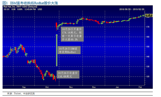 2018年10月,IBM宣布将收购开源软件公司Redhat全部股份,交易金额达340亿美元,较Redhat前一交易日收盘价溢价62.8%,是IBM公司也是整个开源软件行业的最大并购,Redhat股价下一交易日开盘大涨近50%(见图1)。