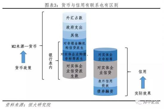 而两者又有不同,首先货币是货币政策的目标,信用则是信用派生所产生的实际结果。其次,并非所有货币都由银行表内信用派生产生,外汇占款投放、政府支出等均会对广义货币供应量产生影响;也并非信用派生都会创造货币,只有银行通过表内扩张的方式派生的信用才可以创造货币,表外信用投放、债券、股票等直接融资均不直接创造货币。