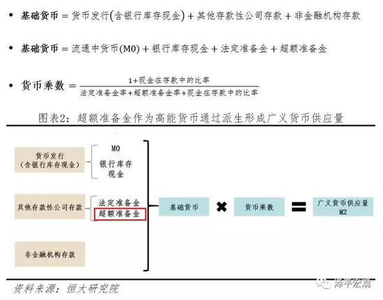 在信用货币时代,货币主要由央行和商业银行通过资产扩张的方式创造。央行创造基础货币,并通过调节基础货币来调控商业银行创造广义货币的能力;现实中真正的高能货币是超额准备金,央行数量型货币政策的落脚点在于调控银行的超额准备金,影响银行的贷款能力。而信用货币的派生主要取决于商业银行,商业银行通过各类贷款、证券净投资以及金融业同业等方式派生货币。基础货币通过货币乘数与货币供给产生联系,即基础货币*货币乘数=广义货币供应量(M2)。