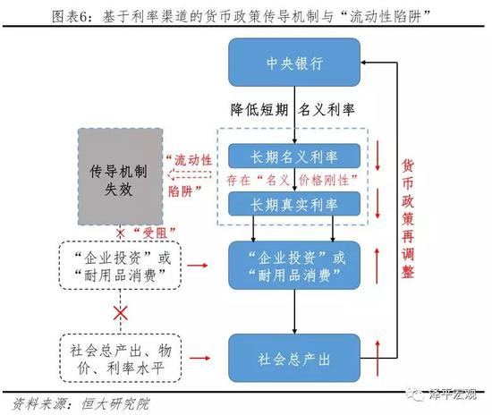 传统的利率传导机制可能会因为“流动性陷阱”而失效,流动性陷阱是凯恩斯提出的一种假说,凯恩斯认为,“当利息率降低到某种水平时,流动性偏好几乎变为绝对的,每个人都宁可持有现金,而不愿意持有债券,因为债券所能得到的利息率太低。”当利率低到降无可降的地步时,单靠货币政策已无法达到刺激经济的目的,此时国民总支出、利率、物价都不会发生变动。上世纪90年代的日本曾在金融泡沫破裂后陷入流动性陷阱,日本经济陷入了长达10年的低迷和通缩的恶性循环,需求下降导致生产萎缩、收入降低,进而投资、消费需求继续低迷,且物价下跌导致实际债务上升,经济遭受多重打击。