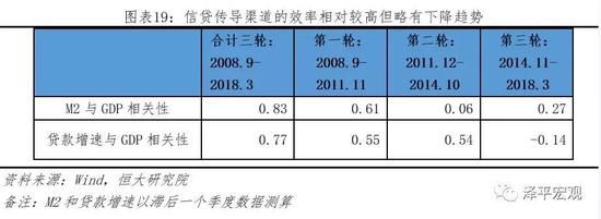 基于以上分析,信贷渠道对于当下我国货币政策传导效率具有举足轻重的作用,但一方面,货币政策数量型调控的有效性日益减弱,亟待向价格型调控转型。随着金融市场深度及广度的不断提升,数量型中间目标的可测性、可控性和与经济的相关性逐渐减弱,而政策对市场利率的引导和调节能力不断加强,随着“两轨并一轨”纳入2019年央行工作目标,利率调控在信贷市场的传导有望迎来突破。另一方面,深层次的结构性问题以及金融周期问题影响信贷渠道传导效率。前两轮宽货币到宽信用的传导处于金融周期上半场,搭配大力的财政政策,地方政府融资平台及企业加杠杆冲动较强,宏观杠杆率快速提升,实体经济结构性问题被掩盖。而2014年底以来的第三次宽货币周期,金融周期接近顶部,金融风险积聚,结构性问题逐步暴露,“大水漫灌”的货币政策难以通过信贷渠道对经济形成有效刺激,传导效率不断降低。