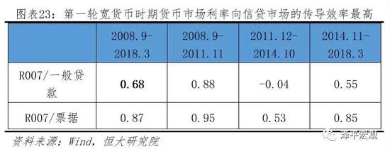通过对R007和金融机构人民币贷款加权平均利率(一般贷款、票据融资)的相关性进行计算,我们发现:(1)总体看来,政策目标利率与信贷市场利率的相关性达到0.68(这里主要参照一般贷款利率),低于其与债券市场的相关性的最高值0.77,表明短期利率在信贷市场上的传导效率弱于债券市场。且政策目标利率在信贷市场传导效率波动性相对更大。(2)票据市场的利率传导极为通畅,相关性高达0.87,这是因为票据市场利率的波动更贴近银行间市场利率,且票据市场的市场化程度相对较高。(3)从横向时间对比来看,第一轮宽货币(2008.9-2011.11)对应的利率传导最为通畅,第三轮次之,且相对第二轮大幅改善,这与政策目标利率在债券市场的传导情况类似。2015年商业银行存款利率上限管制的放开打通了利率市场化的关键一步,但目前央行仍公布基准利率,市场利率与基准利率存在“两轨”,阻碍货币政策的利率调控在信贷市场上的传导。2019年央行明确将“两轨并一轨”纳入工作目标,利率调控在信贷市场传导有望迎来突破。