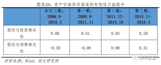 资产价格渠道强调货币政策通过影响股价而影响企业投资和消费者非耐用品支出行为,由于资产价格渠道中预期因素明显,更多作为货币政策传导的协同渠道。我们选取沪深300指数当季同比为股价的代表指标,计算其与投资与消费增速的相关性,我们发现:(1)股价与投资相关性总体高于与消费相关性,但后者相关性逐步提升,体现股票市场的健康发展对于居民财富效应的影响日益显著,但整体来看,资产价格渠道传导相关性低于信贷传导渠道和利率传导渠道对应的相关性。(2)从时间维度来看,资产价格渠道在第三轮的传导效率相对第二轮明显改善,显示资产价格渠道的重要性日益显著。
