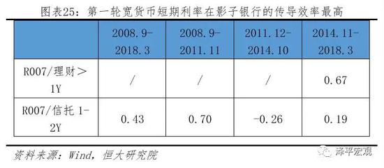 2014年后,在金融自由化以及货币政策宽松的背景下,影子银行迅速发展,在一定程度上满足了实体经济的部分融资需求。通过计算R007和理财产品预期收益率(1年以上)、贷款类信托预期年收益率(1-2年)的相关性,我们发现:(1)总体来看,政策目标利率在影子银行体系的传导效率偏低,仅为0.43,低于短期利率在信贷市场和债券市场的传导效率,主要由于影子银行融资受监管影响波动较大。(2)在第三轮宽货币中,政策目标利率与理财产品收益率的相关性高达0.67,与信托贷款利率的相关性为0.19,与第二轮相比显著回升,显示短期利率在影子银行体系的传导有所好转。