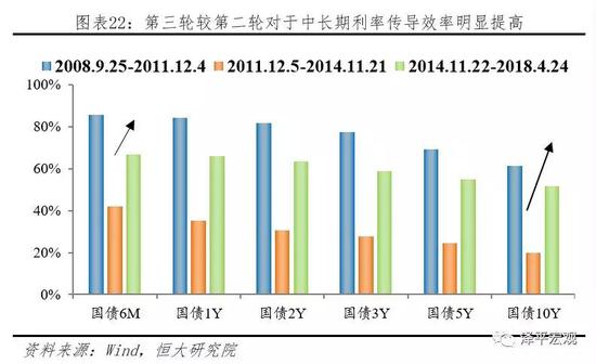 对相关性计算结果进行对比和分析,我们发现:(1)政策目标利率向短期债券市场利率传导效率最高,R007向6个月国债收益率的传导效率最高,而对10年期国债收益率的传导效率最低。(2)从横向时间对比来看,第一轮宽货币(2008.9-2011.12)对应的利率传导最为通畅,第三轮次之,且第三轮相对第二轮大幅改善,我们认为这受益于债券市场规模、交易量、流动性等方面的提升。第三轮与第二轮相比,短期政策目标利率通过债券市场的传导效率明显提高,尤其对于中长期国债利率传导影响更为明显。