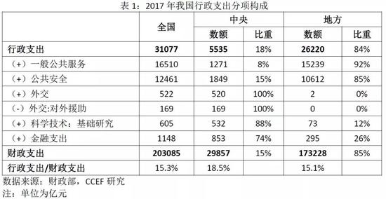 一般公共服务与公共安全支出构成我国行政支出的主体(93%),2017年全国行政支出中二者分别占53%、40%。根据2017年中央及地方财政支出决算数,行政支出大多集中在地方,中央与地方的分配比例约为1:5。从分项来看,地方政府承担92%的一般公共服务支出、85%的公共安全支出。