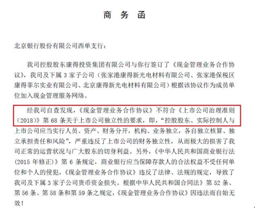 有了在北京银行的资金归集,康得新甩起锅来得心应手。上周康得新向北京银行西单支行发出《商务函》,指出《现金管理业务合作协议》因违反法律而自始无效,要求恢复相应子账户的独立性。同时,公司管理层已将西单支行的违规行为向监管部门进行投诉。